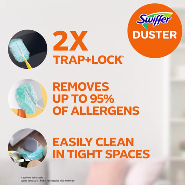 Swiffer Dusters TRAP + LOCK dust wherever dust shows up, including fan blades, blinds, car interior, keyboard vents, bookcases, and more. They are made with specially coated fibers that grab onto dust & don't let go. Assembled in the USA.
