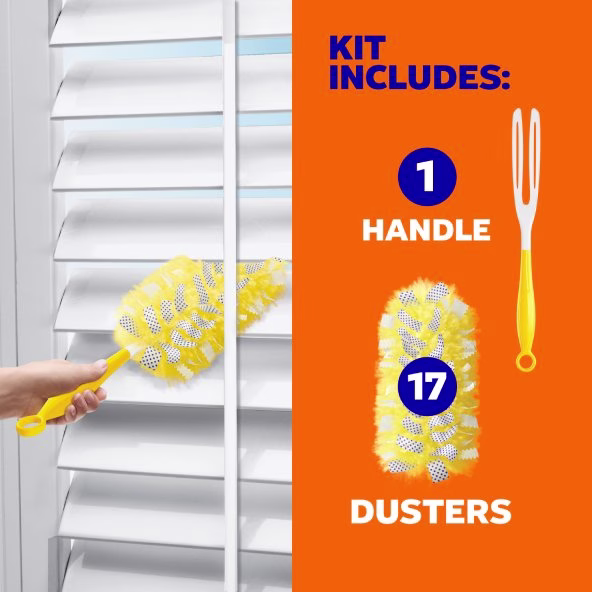 SWIFFER HEAVY DUTY DUSTER KIT with a SHORT HANDLE picks up 5X MORE* dust & allergens.** Heavy Duty Duster has DUST-BUSTING STRIPS to break down layers of built-up dust, and thousands of fluffy, SPECIALLY-COATED FIBERS that grab onto dust in every direction. 360° DESIGN makes it easy to clean hard-to-reach places, like blinds and around knickknacks. Refill Dusters available.