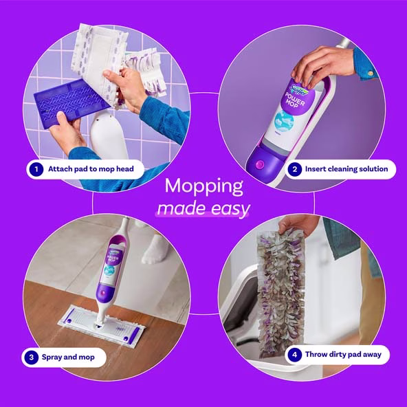 Mop smarter with the Swiffer PowerMop, an all-in-one mopping system that gives you a mop and bucket clean in half the time*. The multi-surface mopping pads have 300+ scrubbing strips that reach deep into grooves and grout to remove sticky spills and daily dirt and grime. The fresh scent of PowerMop solution will fill your home with freshness for hours**. Some assembly required; batteries included.