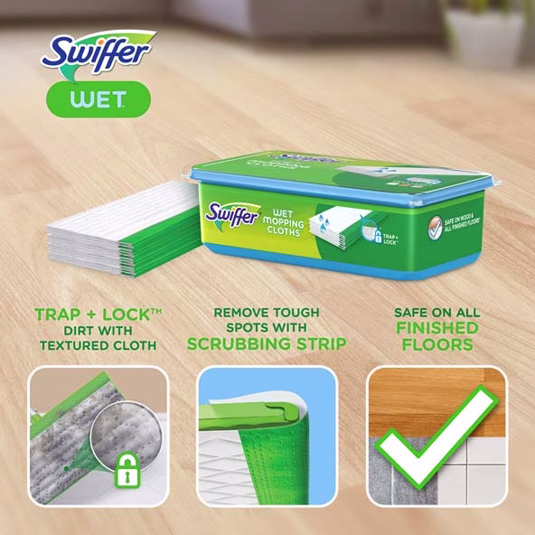 Swiffer Sweeper wet mop textured cloths trap and lock dirt deep in cloth. They are safe to use on all finished floors* and have a scrubbing strip to remove tough spots.